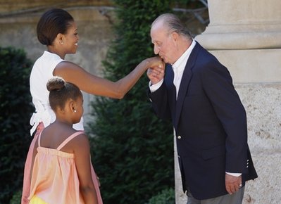 據(jù)報(bào)道,米歇爾和薩莎在當(dāng)?shù)貢r(shí)間8日下午不到1點(diǎn),抵達(dá)西班牙國王卡洛斯和王后索菲婭度假的馬略卡行宮。國王、皇后親自在門前迎接。