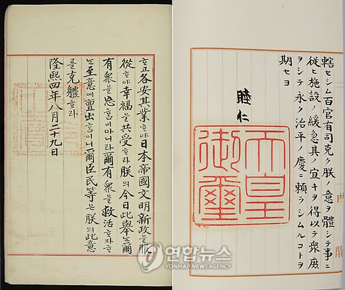 韓日合并當(dāng)時(shí)第三任朝鮮統(tǒng)監(jiān)寺內(nèi)正毅于1910年8月22日全權(quán)委任大韓帝國(guó)總理大臣李完用勸說(shuō)純宗皇帝在條約上簽名,純宗皇帝被逼無(wú)奈,印上國(guó)璽(大韓國(guó)璽),并在上方署名。但條約若要生效,須公布兩國(guó)皇帝的詔書(shū)。純宗在條約上署名后,寺內(nèi)正毅與李完用簽署有關(guān)雙方各自準(zhǔn)備詔書(shū)的協(xié)議。再之后的8月29日,韓日兩國(guó)頒布了詔書(shū)。