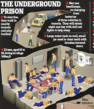 為了養(yǎng)活妻子和兩個(gè)年幼的孩子,巴斯托斯不得不前往智利北部尋找工作,幾經(jīng)周折,2個(gè)月后他終于在地處北部阿塔卡馬沙漠的圣何塞銅礦找了份礦工的工作。然而讓人做夢也沒想到的是,剛剛逃離地獄的巴斯托斯,這一回竟然又跳入了“火坑”。8月5日,位于科比亞波市附近的圣何塞銅礦發(fā)生嚴(yán)重塌方,巴斯托斯與其他32名礦工被困井下700米處,直到17天后發(fā)被人發(fā)現(xiàn)時(shí),仍然奇跡般存活著。