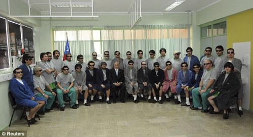 中新網(wǎng)10月15日電 據(jù)外電報道,戴著護(hù)視鏡,身著醫(yī)用長袍,33名智利礦工獲救后在醫(yī)院團(tuán)聚,拍下了他們重見天日后的首張集體照。