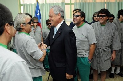 同時,智利總統(tǒng)皮涅拉在堅守礦井現(xiàn)場,迎接所有礦工逐一出井后,當(dāng)天前往礦工所在醫(yī)院進(jìn)行探望。他與礦工們握手交談,對他們重獲新生表示祝賀。