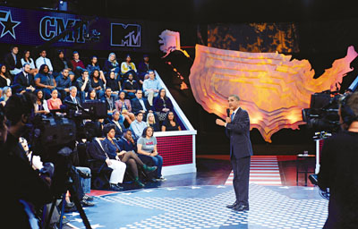奧巴馬現(xiàn)身由“黑人娛樂電視”(BET)、“鄉(xiāng)村音樂電視”(CMT)和MTV電視臺(tái)主辦的直播節(jié)目,和年青人面對(duì)面談就業(yè)、移民和同性戀等問題。這些電視臺(tái)的主要收視群都是80、90后年青人。