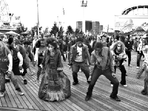23日,在紐約布魯克林,人們模仿邁克爾·杰克遜專輯《戰(zhàn)栗》里的“僵尸舞”動(dòng)作,迎接即將到來的萬圣節(jié)。這也是為紀(jì)念這位已故流行樂天王而在全球各地展開的“讓世界戰(zhàn)栗”活動(dòng)的一部分。當(dāng)天,全球30多個(gè)國家的270多個(gè)城市的杰克遜歌迷也在同一時(shí)間跳起了“僵尸舞”。(宗和)