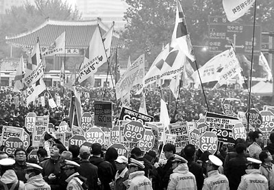 中新網(wǎng)11月8日電 韓國首爾將于本周四、五舉行20國集團(G20)峰會,當(dāng)?shù)?日有4萬人在市政廳附近的首爾廣場示威,反對全球化及美韓自由貿(mào)易協(xié)定等,逾8000名防暴警察在場戒備。據(jù)香港《文匯報》報道,數(shù)百名群情洶涌的示威者嘗試游行到市中心,與防暴警察沖突,警方發(fā)射胡椒噴霧阻止人群前進。