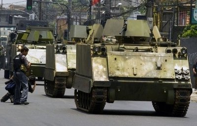 最少10輛配備點(diǎn)50口徑機(jī)關(guān)槍的“M113”裝甲車,隆隆駛過(guò)里約熱內(nèi)盧市中心街頭,長(zhǎng)驅(qū)直進(jìn)開往該市北面的克魯賽羅貧民窟。當(dāng)局從來(lái)未試過(guò)出動(dòng)這種重裝備對(duì)付毒販,今次十足打仗一樣,許多居民都嚇了一跳。