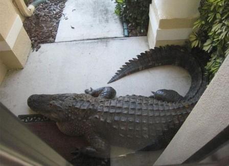 中新網(wǎng)4月29日電 據(jù)英國媒體報道,日前在佛羅里達(dá)州郊區(qū)的一家住戶門外驚現(xiàn)一條長達(dá)11英尺的鱷魚,這家主人被困屋內(nèi)緊急報警,野生動物專家用了一個小時才把這位“不速之客”請走。