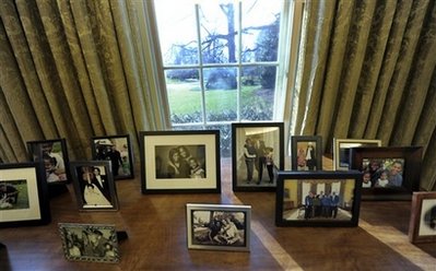 桌上的瓷器不見蹤影,代替的是歷史感強(qiáng)烈的美洲陶罐和器具;書架上出現(xiàn)的是馬丁•路德金在1963年華盛頓游行時發(fā)表的著名演說“我有一個夢的”的照片;而在總統(tǒng)辦公桌后面的桌上則擺滿了奧巴馬和家人的照片。