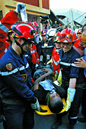 法國救援隊(duì)23日從瓦礫里救出了一名24歲的海地男子。這名男子已經(jīng)被埋了11天。救援隊(duì)員們激動(dòng)地說:“這簡直就是生命奇跡!