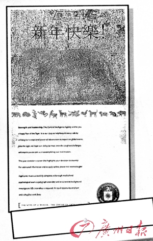 CIA還首度以中文“新年快樂(lè)”向華裔民眾拜年,廣告畫(huà)面上還配有一只威風(fēng)凜凜的老虎,中國(guó)味濃厚,備受矚目。