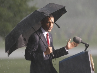 5月31日下午,奧巴馬準備在林肯國家公墓發(fā)表國殤日演說,正當他站上講臺之際,天空中忽然下起大雨,一時間雷電交加,風也狂吹,一旁的旗幟不停左右搖擺。由于雷雨越下越大,完全沒有趨緩,奧巴馬撐著一把大黑傘,宣布演說暫時取消。