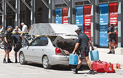 中新網(wǎng)6月26日電 據(jù)香港《文匯報(bào)》26日?qǐng)?bào)道,G20峰會(huì)前夕,各成員國(guó)領(lǐng)袖陸續(xù)抵,加拿大警方在多倫多市采取極嚴(yán)密保安措施。連日來(lái)已有3名可疑人士被捕,其中1名53歲男子前日駕車(chē)經(jīng)過(guò)峰會(huì)會(huì)場(chǎng)禁區(qū),由于車(chē)頂綁著1個(gè)鋼制儲(chǔ)物箱,模樣怪異,引起警方注意。警察攔車(chē)檢查,赫然發(fā)現(xiàn)車(chē)上有十字弓、電鋸、棒球棍、大錘外,還有多種不明液體。警方?jīng)]收這批物品,并將他拘捕。