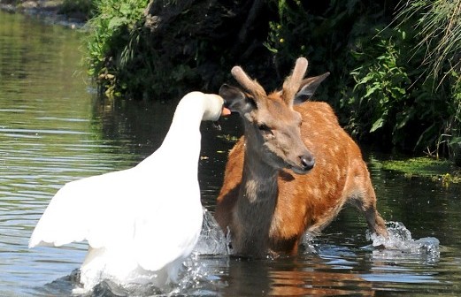 一只年幼的小鹿冒險在倫敦的Richmond公園里想小浸鹿蹄,不幸地是,該地盤內(nèi)的主人天鵝卻并不想和小鹿分享這一湖水,立刻對準小鹿的耳朵猛啄,用力捍衛(wèi)自己的領土。盡管小鹿在體形上占據(jù)優(yōu)勢,但是小鹿最終還是不敵兇悍的天鵝,落慌而逃。