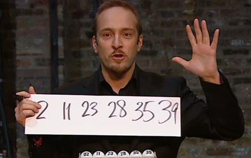 英國電視臺現(xiàn)場直播了當期彩票的開獎過程,由機器隨機選擇箱子中的球。而在另一個演播室,放置了一臺電視播放開獎過程。這位身處另一演播室的神秘“幻術(shù)師”在結(jié)果出來之前,就背對電視寫下了一組數(shù)字,分別是2、11、23、28、35和39。結(jié)果證實,他所預測的數(shù)字與中獎結(jié)果完全一致,令人瞠目結(jié)舌。