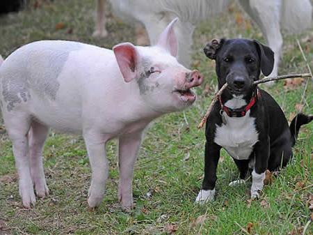 據(jù)臺灣東森新聞網(wǎng)報道,英國一動物庇護站人員表示,小豬剛被收養(yǎng)時,因為容易生病,所以就把它放養(yǎng)在房子周圍,以方便觀察病情。沒想到它很快就與周圍的小狗打成一片。小豬剛進(jìn)來的時候體型只有小狗的一半,5周后就比小狗大上了2倍。