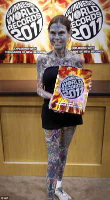 中新網(wǎng)5月27日電 據(jù)英國媒體報道,美國女孩希努斯(Julia Gnuse)全身95%都覆蓋著五顏六色的紋身。她也被吉尼斯世界紀錄評為世界上紋身最多的女人。5月26日,她出席了紐約圖書博覽會,也展示了自己身上的紋身。