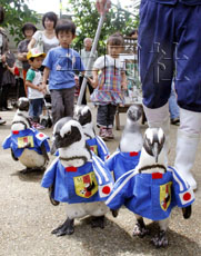 中新網(wǎng)6月11日電 據(jù)日本共同社網(wǎng)站報(bào)道,11日,身穿南非世界杯日本隊(duì)服的企鵝們出現(xiàn)在日本島根縣松江市的“松江 Vogel Park”公園,為出征世界杯的日本選手“吶喊助威”。