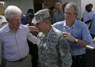 這兩位前總統(tǒng)是于本周一到海地進行人道訪問,視察當?shù)?月12日大地震后的災(zāi)情。兩人特地到首都太子港探訪災(zāi)民,當經(jīng)過頹垣敗瓦的廢墟時,不約而同和居于臨時帳篷的災(zāi)民握手。