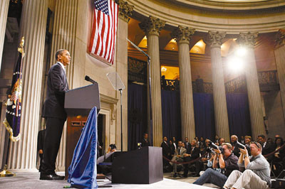 演說(shuō)于當(dāng)?shù)貢r(shí)間14日正午12時(shí)10分舉行,地點(diǎn)是紐約聯(lián)邦國(guó)家紀(jì)念堂,鄰近紐約證券交易所。奧巴馬重申上任以來(lái)穩(wěn)定經(jīng)濟(jì)措施的成效,并強(qiáng)調(diào)華府已成功避免第2次大蕭條重臨。