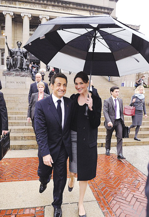 法國(guó)娛樂雜志的網(wǎng)站用頭條報(bào)道薩科齊夫婦到訪紐約,紐約給了薩科齊在自己的國(guó)家,也好久沒有感受到的關(guān)注,哥倫比亞大學(xué)學(xué)生的熱情,更讓薩科齊心情大好,他放棄事先準(zhǔn)備好的講稿,改說肺腑之言。從薩科齊在哥倫比亞大學(xué)演講的安排,就可以看得出來法國(guó)人是多么注重外在美。薩科齊在哥倫比亞演講的白色講臺(tái)和通往講臺(tái)的淺灰色地毯,都是他自己從法國(guó)帶去的。薩科齊穿深藍(lán)西裝、打黑領(lǐng)帶,布呂尼穿黑上衣、配灰裙子,加上黑白相間的花傘,看得出來是經(jīng)過刻意搭配,和地毯與講臺(tái)呼應(yīng)。