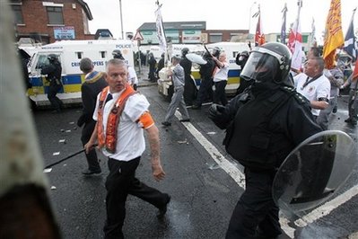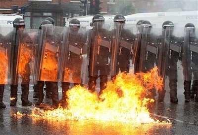 13日晚,在貝爾法斯特參加游行的新教徒向防暴警察投擲汽油彈、焰火和磚塊,警察則以高壓水槍還擊。在雙方的對峙中,警方至少開出一槍,而有6枚燃燒彈被擲向了防暴警察。
