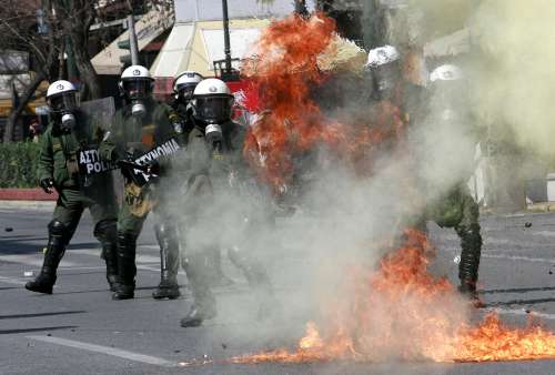 其中在雅典中部有三萬多人示威,于國會(huì)大樓外等多處地方,示威者向防暴警察投擲石塊和汽油彈,放火燒車和垃圾桶,又破壞銀行、珠寶店、戲院等10多間商店,警方發(fā)射催淚彈和手榴彈驅(qū)散人群。