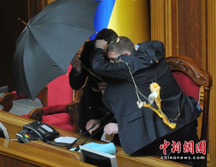 27日,烏克蘭最高拉達召開會議,討論是否通過俄黑海艦隊駐烏克蘭克里米亞半島的租期延期協(xié)議,但會議現(xiàn)場一度發(fā)生騷亂。議長利特溫被反對派議員用雞蛋打,不得不撐開黑傘躲在后面,F(xiàn)場還發(fā)生了肢體沖突,人們扭打在一起,一片混亂。更有人趁亂在議會廳內(nèi)放置至少二顆煙霧彈,導致大廳被一片濃煙籠罩,大家紛紛捂住口鼻。