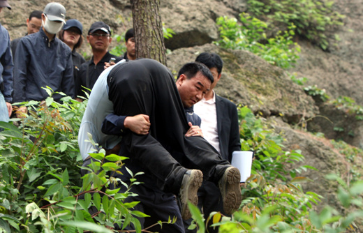 當李某走到盧武鉉跳崖的落地點貓頭鷹巖下方時,他哭出了聲。李某跌坐在地,半天沒有回過神來。遺屬方面代表、前青瓦臺秘書室長文在寅在現(xiàn)場向李某等人詳細地詢問了發(fā)現(xiàn)盧武鉉的經(jīng)過。