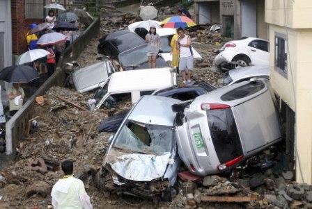 該國第二大城市釜山在強(qiáng)降雨后發(fā)生泥石流。
