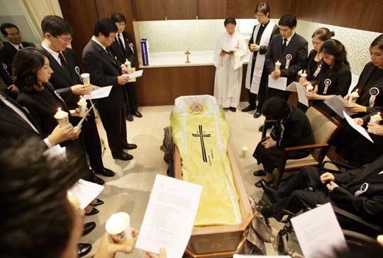 下午1時(shí)30分開(kāi)始在首爾西橋洞教堂主任神父尹日善(音)的主持下舉行了入殮彌撒。