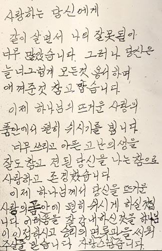 信中稱:“在一起生活的過(guò)程中我犯下的錯(cuò)誤太多了。但你總是寬容地原諒一切過(guò)錯(cuò),還很愛(ài)惜我,真的很感謝你。希望今后能在上帝溫暖的愛(ài)的懷抱中安息。你挺過(guò)了極其苦難和悲傷的人生,我真的很愛(ài)、很尊敬你。你的妻子李姬鎬!