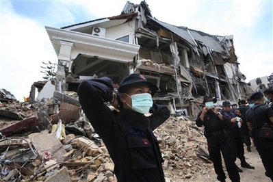 印尼“西蘇門答臘省”首府“巴東”地區(qū)星期三下午發(fā)生里氏7.6級強震,緊接著第二天早上又發(fā)生一起6.6級的余震,對當(dāng)?shù)卦斐蓮姶蟮钠茐牧Γ粌H災(zāi)區(qū)被夷為平地,而且斷水?dāng)嚯娪謹(jǐn)嘤,?lián)外道路也不通,當(dāng)?shù)剡遭滂沱大雨襲擊,使得災(zāi)情更加惡化,救災(zāi)困難重重。