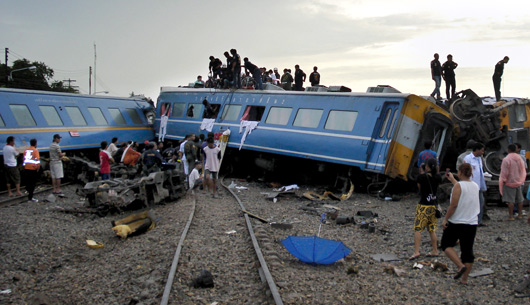 據(jù)此間泰國民族網(wǎng)站報道,事故今天早上四點四十五分發(fā)生在華欣縣的號陶站,事故發(fā)生時,這輛有十六節(jié)車廂的火車至少有六個車廂出軌,并當場造成七名女旅客死亡,逾百名旅客受傷。