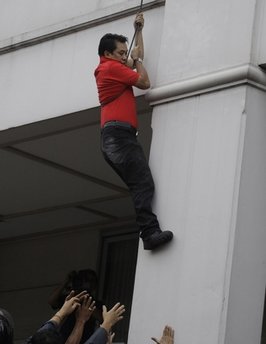 紅衫軍領(lǐng)導(dǎo)人阿里斯曼(Arisman Pongruanrong)通過(guò)繩梯從位于曼谷市中心的這家酒店爬下,在等候的紅衫軍民眾的幫助下,進(jìn)入一輛車(chē)中然后迅速離開(kāi)。另外一名紅衫軍領(lǐng)導(dǎo)人從酒店窗戶(hù)爬出并順著一棵樹(shù)滑下,也成功逃離現(xiàn)場(chǎng)。