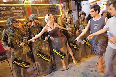 數(shù)以百計(jì)的士兵配備了M-16機(jī)關(guān)槍,在商業(yè)區(qū)中心地帶Silom路進(jìn)行巡邏,密切關(guān)注路口對面的示威者動向,那些示威者已經(jīng)集結(jié)了鋒利的竹杖,用卡車輪胎搭起路障。