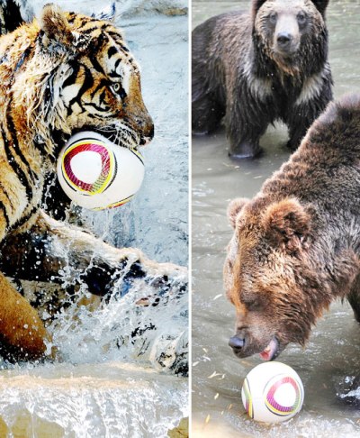 據(jù)報道,6月9日,在韓國首爾白天最高氣溫達(dá)32度的酷熱天氣下,京畿道龍仁愛寶樂園動物園的老虎和熊正用2010南非世界杯官方比賽用球“Jabulani”玩游戲。