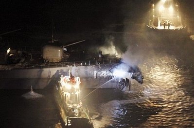 一九八一年開始服役的KURAMA號,隸屬日本海上自衛(wèi)隊第二艦群,全長一百五十九米,寬十七點五米,排水量五千二百噸,最大時速三十一海里,搭乘三架反潛直升機。在剛剛于十月二十五日結束的日本海上自衛(wèi)隊觀艦式(相當于海軍閱兵式)上,該船作為“觀閱艦”為日本副首相菅直人的搭乘艦。事發(fā)時,KURAMA號正處于結束觀艦式后返回佐世;氐耐局小E炆陷d有一百五、六十名自衛(wèi)隊隊員。而與其相撞的韓國集裝箱船“CARINA STAR”號全長一百二十七米,寬二十米,事發(fā)時正處于自韓國釜山前往日本大阪的途中。