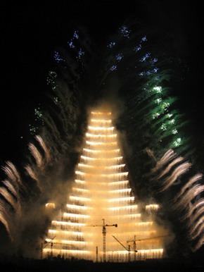 看點(diǎn)二是“強(qiáng)盛大國的火花”、“我們將勝利”兩場煙火晚會(huì)。4月14日晚,一場旨在紀(jì)念金日成主席誕辰97周年、宣誓邁向強(qiáng)盛國家的煙火表演照亮了平壤的夜空。隨著聲聲炮響,五顏六色、造型各異的美麗煙火依次騰空,把大同江上下游兩座橋之間的區(qū)域變成了煙火的海洋。朝鮮最高領(lǐng)導(dǎo)人金正日同志的出場令全場氣氛格外高漲,掌聲和歡呼聲回蕩在大同江的兩岸。有意思的是,13日、15日平壤下了兩場春雨,唯獨(dú)14日萬里晴好,給煙火表演留下了完美的時(shí)間窗口。5月1日在柳京大廈舉行的焰火晚會(huì)更具特色,巨大的樓體第一次流光溢彩,散發(fā)出美麗的火光,那神奇的景象讓人難忘。