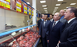 陪同普京前往“十字路口”超市連鎖店的有俄羅斯政府第一副總理祖布科夫和商界代表等。普京首先走到奶制品柜臺前,詢問了奶制品加價(jià)情況?瓢屠瓭色@悉,超市中的奶制品平均加價(jià)10盧布出售,但他指出,“也有低于成本價(jià)出售的情況”。
