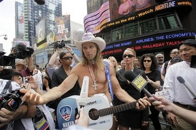 中新網(wǎng)7月23日電 美國(guó)紐約知名度頗高的街頭藝人“裸體牛仔”宣布要競(jìng)選紐約市長(zhǎng),他承諾要把他的穿著風(fēng)格、也就是不穿,落實(shí)在施政上,讓政治更透明。