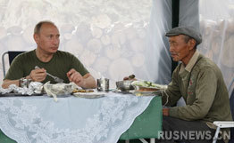 當(dāng)普京在一個(gè)無人的山地停留時(shí)發(fā)現(xiàn)一群羊,一名當(dāng)?shù)氐哪裂蛉苏诜叛。普京邀請牧羊人與他一起喝茶,而牧羊人回請普京到他的住處去看看。普京同意之后,牧羊人返回家中,過了一會兒,他和自己的兒子一起同返回,還為普京牽來一匹馬。