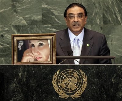 中新網(wǎng)9月27日電 巴基斯坦總統(tǒng)扎爾達(dá)里在聯(lián)合國大會(huì)上演講時(shí),把他的已故夫人貝-布托和岳父布托的照片擺上演講臺(tái),并吁請世界各國為巴國打擊恐怖主義和宗教極端主義提供更多協(xié)助。