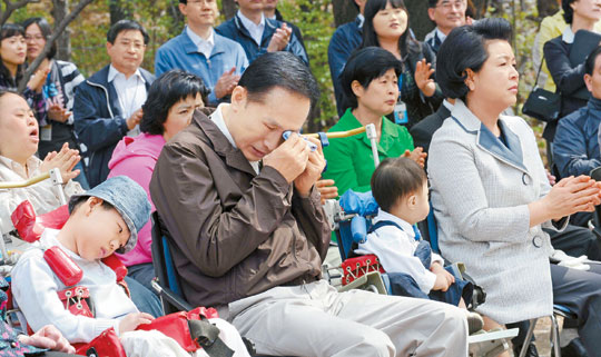 中新網(wǎng)4月20日電 據(jù)韓國《中央日報(bào)》報(bào)道,韓國總統(tǒng)李明博于“殘疾人日”前一天的19日訪問了京畿道高陽市的園林一山療養(yǎng)院,并與夫人金潤玉女士一起觀賞了殘疾人合唱團(tuán)“靈魂之音”的演出。李明博總統(tǒng)及夫人深受感動(dòng),流下了淚水。
