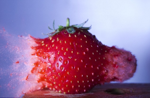 中新網(wǎng)3月26日電 據(jù)英國《每日郵報》報道,疾速飛行的子彈橫穿過草莓的瞬間會帶來怎樣的視覺沖擊?藝術(shù)家Alan Sailer使用氣槍、相機以及圖片編輯軟件,為我們呈現(xiàn)了這一瞬間的視覺盛宴。