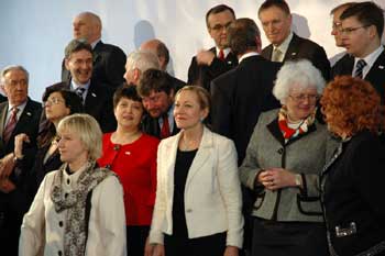 7日上午他們?cè)诜鼱査吆优系牧兄Ф厥康菍m會(huì)見了輪值主席國(guó)捷克的政府內(nèi)閣成員。官員們按照地上已標(biāo)好的名字“對(duì)名入站”,讓記者們拍攝合影。(黃頻)