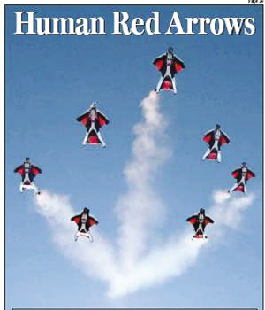 當(dāng)“Topgun”表演時,16名隊員的飛行時速可以達(dá)到驚人的193公里,但每名隊員之間的距離有時只有幾英寸之遠(yuǎn)。他們猶如一只只巨大的蝙蝠在空中急速穿梭,并以密集編隊在空中翻飛并不停變換隊形,其技巧和真正的“紅箭”飛行表演隊不相上下,精湛技術(shù)令人叫絕,壯觀場面可謂酷到極點。但顯然和“紅箭”不同的是,他們表演時無須使用任何飛機,全憑自己的身體在空中“肉搏”。