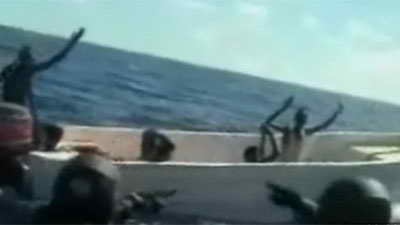 當(dāng)時(shí),海盜分乘兩艘“襲擊艦船”和一艘“母船”追擊“雪月”號,上面載有食物和武器。法國護(hù)衛(wèi)艦上海員意識到被跟蹤之后,他們立即將護(hù)衛(wèi)艦轉(zhuǎn)向迎著太陽,以使跟蹤者更難辨認(rèn)。“雪月”號上武器裝備精良,并且配備有精密的雷達(dá)。當(dāng)海盜船一直接近到能登上護(hù)衛(wèi)艦的近距離之后,法國海軍迅速派出快艇和直升飛機(jī)攔截了這批海盜。 錄像顯示11名攜帶火箭發(fā)射裝置以及卡拉什尼科夫步槍的海盜向法國海軍舉手投降。除了有11人落網(wǎng)之外,法國海軍還在海盜船上繳獲了兩支沖鋒槍和火箭發(fā)射器。
