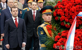 梅德韋杰夫在亞歷山大花園克里姆林宮紅墻下向無名烈士墓敬獻了花圈。俄羅斯總理普京、各部委代表、衛(wèi)國戰(zhàn)爭老戰(zhàn)士都參加了敬獻花圈儀式。