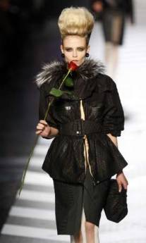 中新網(wǎng)3月10日電 據(jù)路透社報(bào)道,日前在法國知名時(shí)裝設(shè)計(jì)師高堤耶(Jean-Paul Gaultier)的服裝秀上,模特們身著用大把鈔票模樣堆砌而成的黑色禮服,而設(shè)計(jì)師克里斯汀-拉克魯瓦(Christian Lacroix)則設(shè)計(jì)出了巴洛克風(fēng)格的黃金禮服和大毛皮領(lǐng)。巴黎時(shí)裝展就是敢于走頹廢路線。
