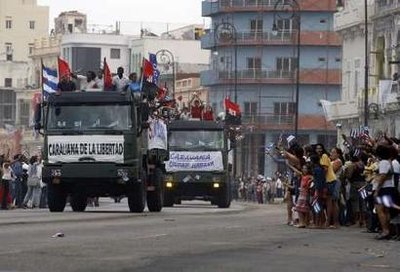 在厄瓜多總統(tǒng)柯雷亞的陪同下,古巴領導人、卡斯特羅之弟勞爾-卡斯特羅參加了在一處前軍事基地舉行的慶祝典禮。這處軍營是卡斯特羅在1959年1月8日抵達哈瓦那后,向成千上萬歡欣鼓舞的古巴人發(fā)表演說的地點。