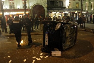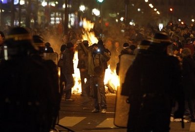 中新網(wǎng)1月30日電 據(jù)香港星島環(huán)球網(wǎng)報道,法國全國有逾百萬人在29日罷工,抗議總統(tǒng)薩科齊處理金融危機的手法未能令工人受惠。在巴黎,示威演變成騷亂,示威者在商業(yè)大街擲玻璃樽和放火,更與警方爆發(fā)推撞,警方施放催淚氣體驅散群眾。